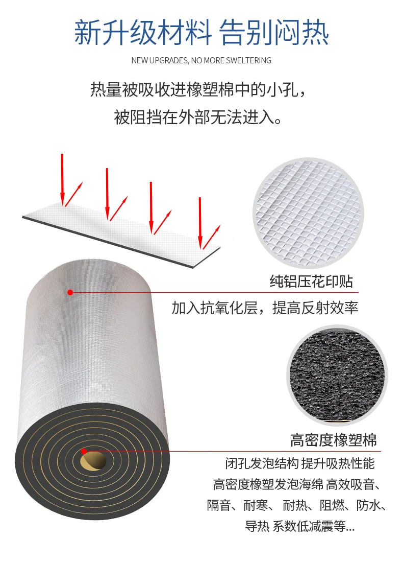 綜上所述,鋁箔不干膠橡塑隔熱棉由鋁箔、不干膠和橡塑材料組成,它們各自具有不同的特點和作用。鋁箔提供了優(yōu)異的保溫和防潮性能,不干膠具有強粘附力和快速粘合的性能,橡塑材料則提供了良好的保溫、緩沖和隔音性能。這些組成部分共同作用,使得鋁箔不干膠橡塑隔熱棉成為一種高效、環(huán)保、可靠的保溫材料,廣泛應(yīng)用于建筑、汽車、家電等領(lǐng)域。