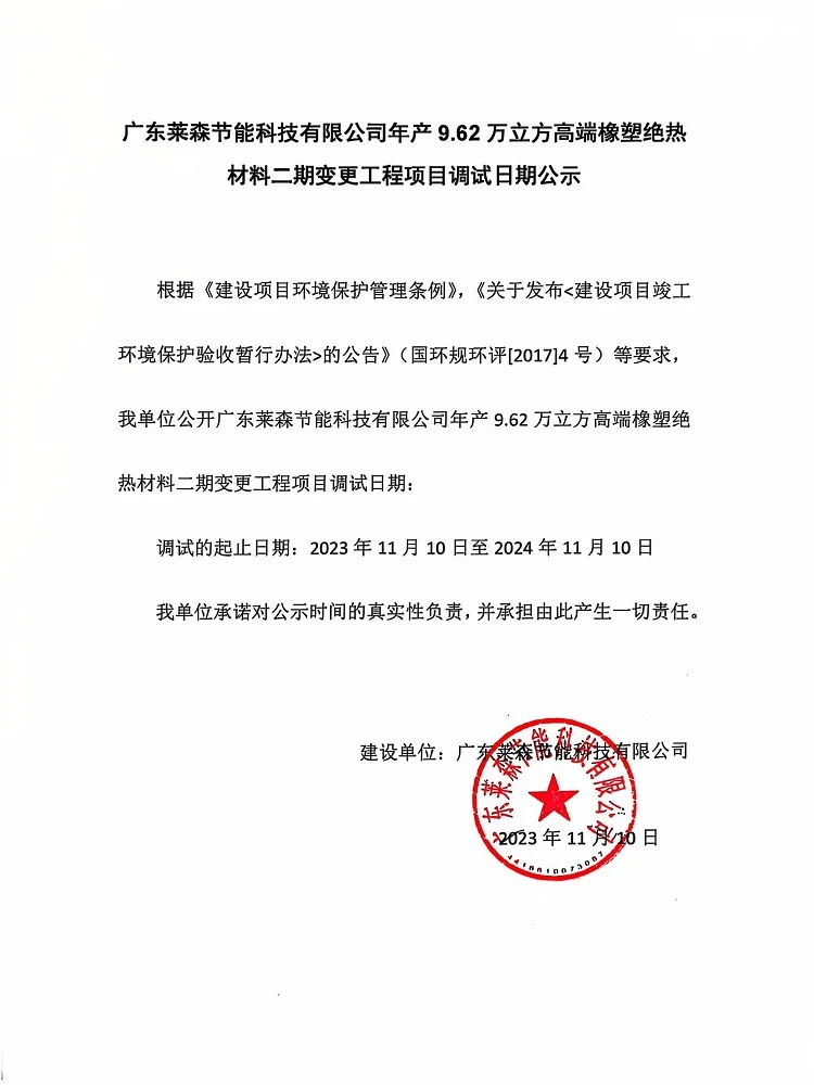 根據(jù)《國務(wù)院關(guān)于修改〈建設(shè)項目竣工環(huán)境保護管理條例〉的決定》(國務(wù)院令第682號),以及環(huán)保部《關(guān)于發(fā)布(建設(shè)項目竣工環(huán)境保護驗收暫行辦法)的公告》(國環(huán)規(guī)環(huán)評[2017]4號),第十一條第(一)項:“建設(shè)項目配套建設(shè)的環(huán)境保護設(shè)施竣工后,公開竣工日期?!爆F(xiàn)將廣東萊森節(jié)能科技有限公司年產(chǎn)9.62萬立方高端橡塑絕熱材料二期變更工程建設(shè)項目調(diào)試時間公示如下: